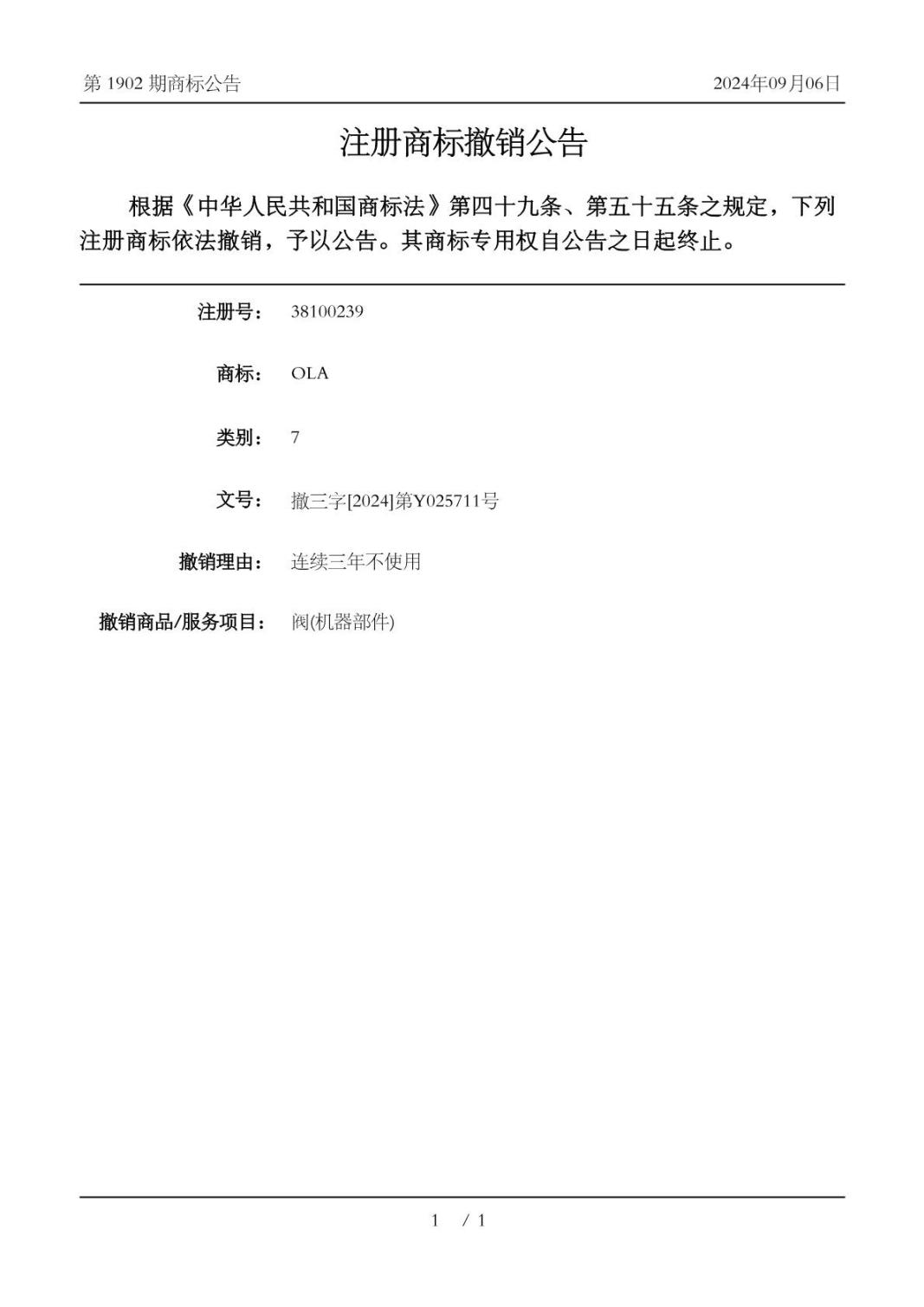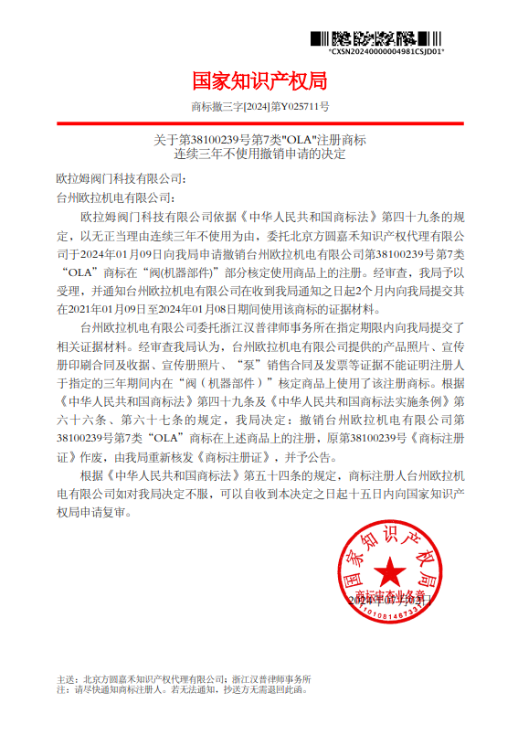 知識(shí)產(chǎn)權(quán)局決定:接受歐拉姆閥門(mén)科技有限公司的撤銷(xiāo)申請(qǐng),撤銷(xiāo)臺(tái)州歐拉機(jī)電有限公司第38100239號(hào)第7類(lèi)“OLA”商標(biāo)在上述商品上的注冊(cè),原《商標(biāo)注冊(cè)證》作廢,并將重新核發(fā)《商標(biāo)注冊(cè)證》并公告。