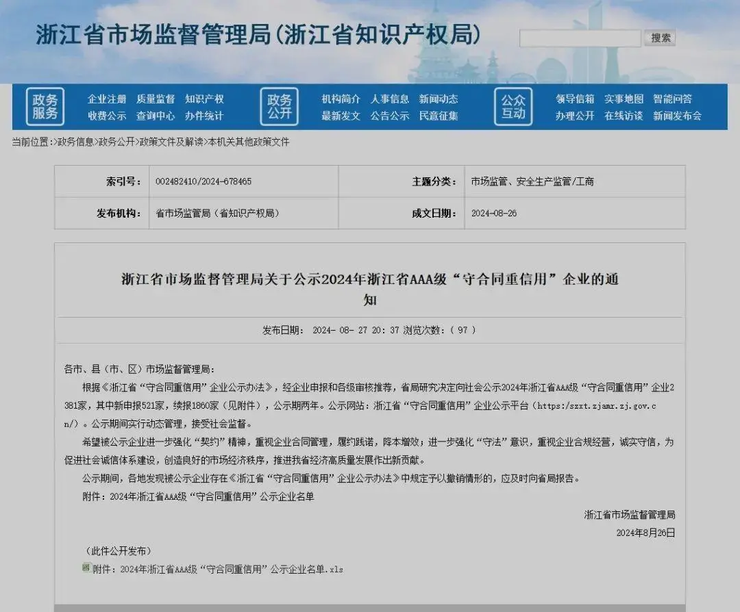 近日,浙江省市場監(jiān)督管理局正式公布了2024年浙江省AAA級“守合同重信用”企業(yè)名單,歐拉姆閥門科技有限公司憑借良好的信譽和優(yōu)質(zhì)的服務,再次獲此殊榮,實現(xiàn)連續(xù)三次蟬聯(lián)。